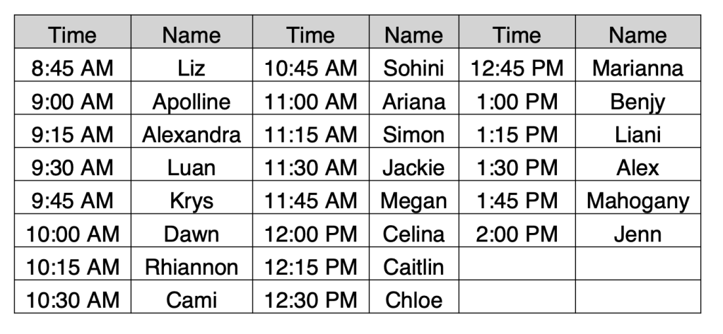 Reminder: No formal class on Tuesday 3/24. Instead show up for your 15-minute advisement slow. The schedule is below.